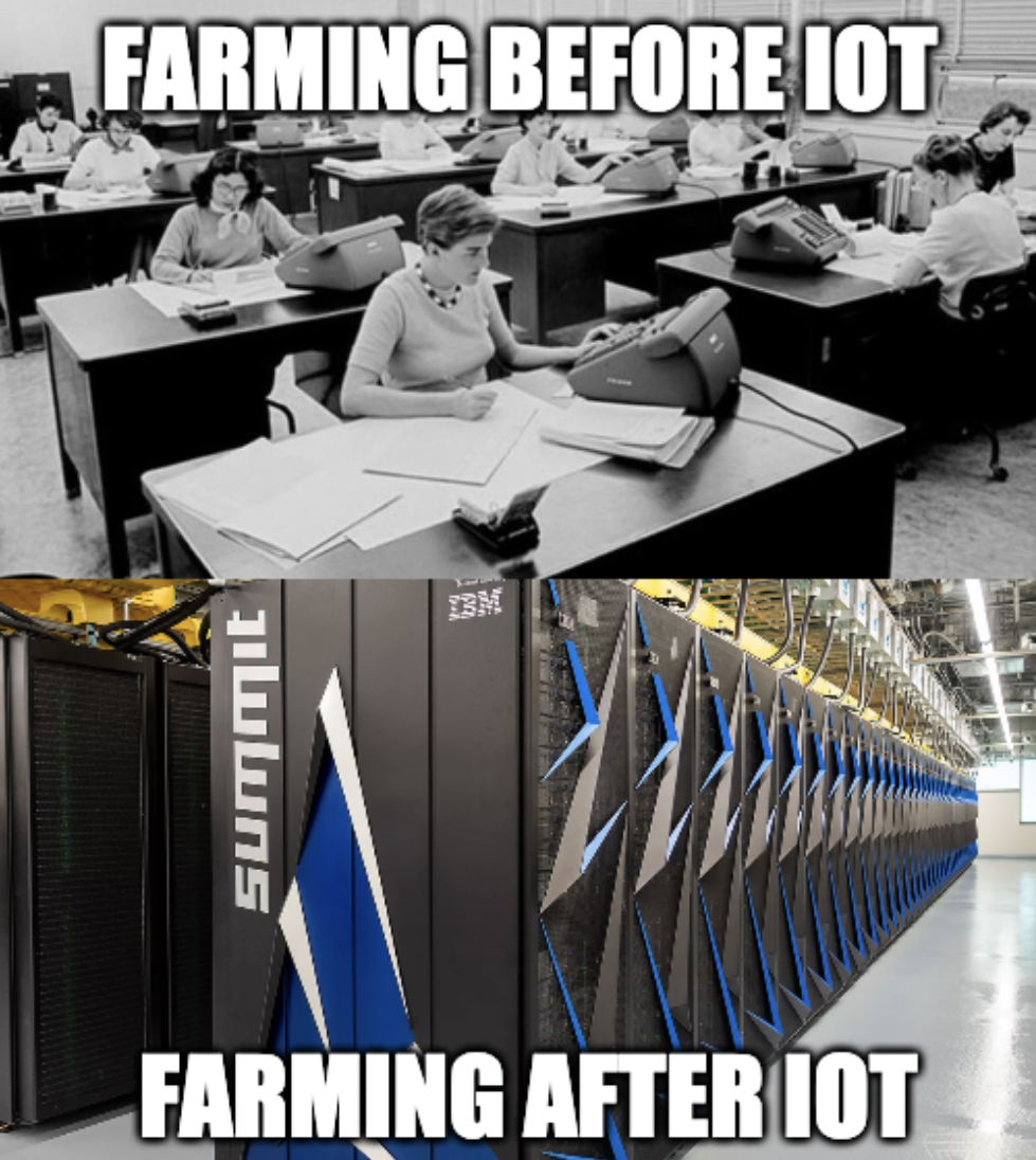 Now thanks to IoT, you can just stick a moisture sensor in the dirt to adjust the watering levels. You can put a temperature sensor around the plants, and have automated systems that adjust the temperature to optimize crop yield.